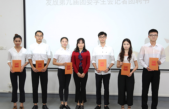余婧老师为第九届团委员工会记者团代表颁发聘书