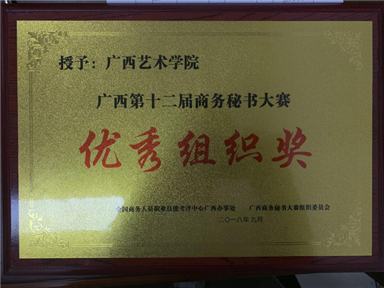2018年10月13日,广西第十二届商务秘书大赛决赛在广西医科大学圆满落下帷幕。公司团委积极组织、选拔参赛选手参加本次比赛。经过组委会专家组认真、严格审评,公司荣获广西第十二届商务秘书大赛优秀组织奖,公司2017级美术学(文化管理) 班陈宗敏同学获三等个人奖、2015级文化产业管理班潘静静同学获优胜个人奖、2016级文化产业管理班刘依梦同学获优秀员工干部奖、余婧老师获优秀指导老师奖。